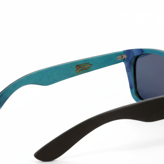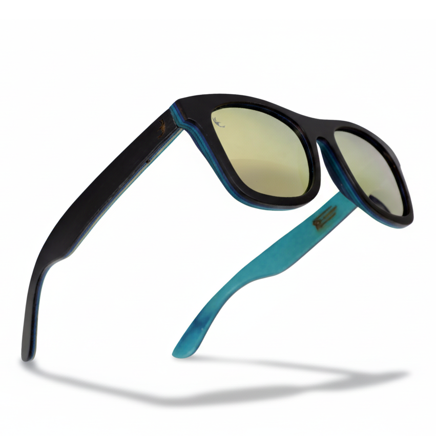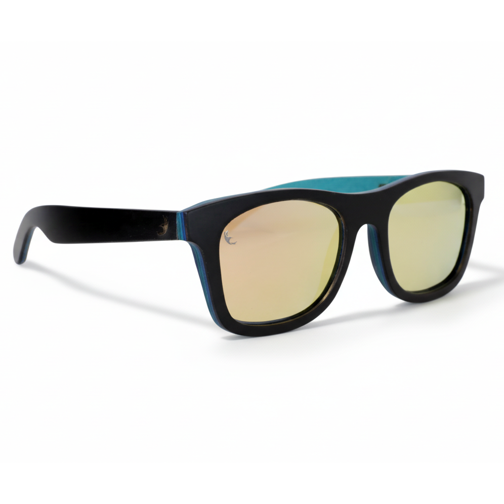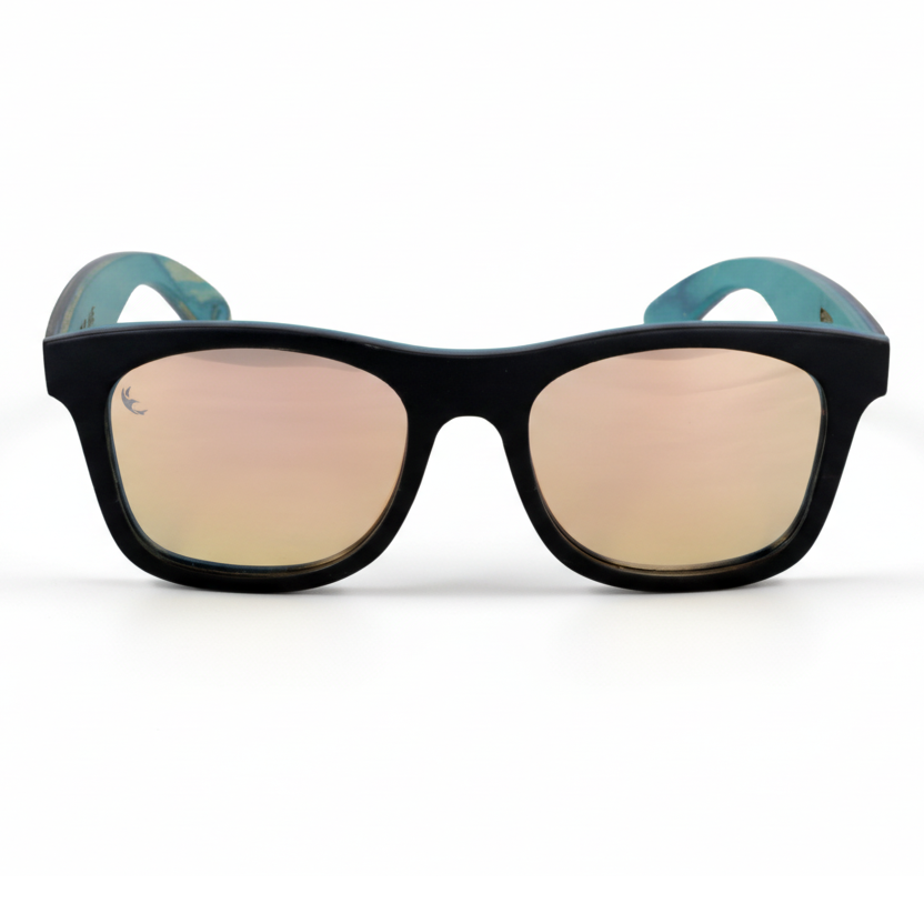• Montura en madera negra mate con interior turquesa – diseño elegante y sostenible.